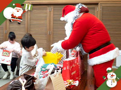交流会はみんなでゲームと恒例のビンゴをしました。今年のゲームはスポンジバットを使って競うゲームを2つやりました。1つはスポンジバットでボールを転がすバットdeボーリング、もう1つは2人一組でバットでボールを挟んで運ぶゲームです。勝ったチームから順に景品をもらいます。あらかじめ狙いを定めていた景品目指して猛ダッシュ!今年も盛り上がることができました。恒例のビンゴでは、サンタが登場し会場が湧きました。サンタさんがビンゴの景品を手渡してくれて、クリスマス気分が一層上がりました♫サンタさんありがとう!会場作りからゲームの時のセッティング、片付けまで、ご家族の皆様がお手伝いしてくださいまして、トラブルもなくとてもスムースに会を進行することができました。ご家族の皆様ご協力いただきありがとうございました。