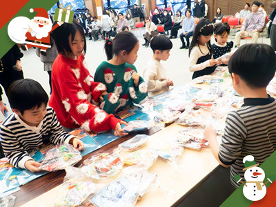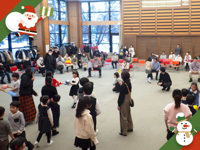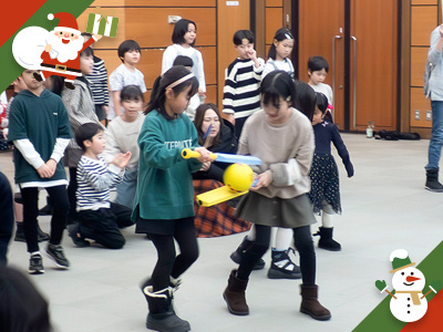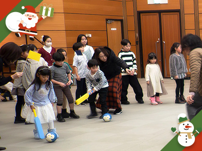 交流会はみんなでゲームと恒例のビンゴをしました。今年のゲームはスポンジバットを使って競うゲームを2つやりました。1つはスポンジバットでボールを転がすバットdeボーリング、もう1つは2人一組でバットでボールを挟んで運ぶゲームです。勝ったチームから順に景品をもらいます。あらかじめ狙いを定めていた景品目指して猛ダッシュ!今年も盛り上がることができました。恒例のビンゴでは、サンタが登場し会場が湧きました。サンタさんがビンゴの景品を手渡してくれて、クリスマス気分が一層上がりました♫サンタさんありがとう!会場作りからゲームの時のセッティング、片付けまで、ご家族の皆様がお手伝いしてくださいまして、トラブルもなくとてもスムースに会を進行することができました。ご家族の皆様ご協力いただきありがとうございました。